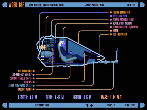 The Work Bee first entered service in 2267 over a hundred years ago. During that time some of the most iconic ship classes have come and gone but this rugged little craft has toiled on. Over the years Work Bees have been stationed at every Star Base and Fleet yards in the Federation. These useful little craft have even found their way in to the auxiliary craft inventory of many ships in the fleet.